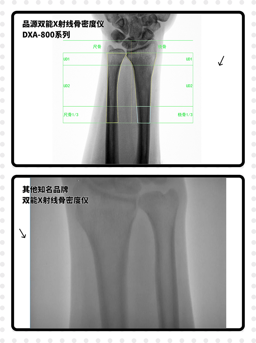 針對臨床常見的前臂骨密度檢測場景,雙能X射線骨密度儀DXA-800E特別搭載非均勻性校正(NUC)算法,專門對前臂圖像進行優(yōu)化處理。